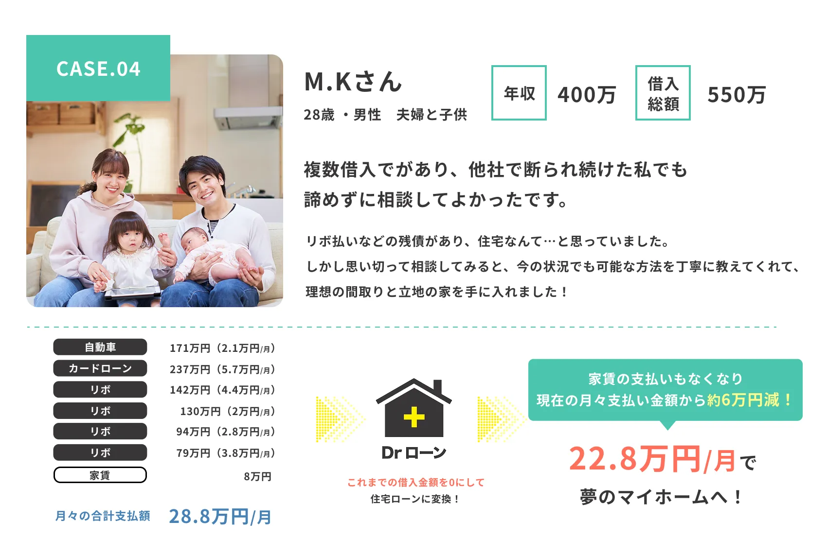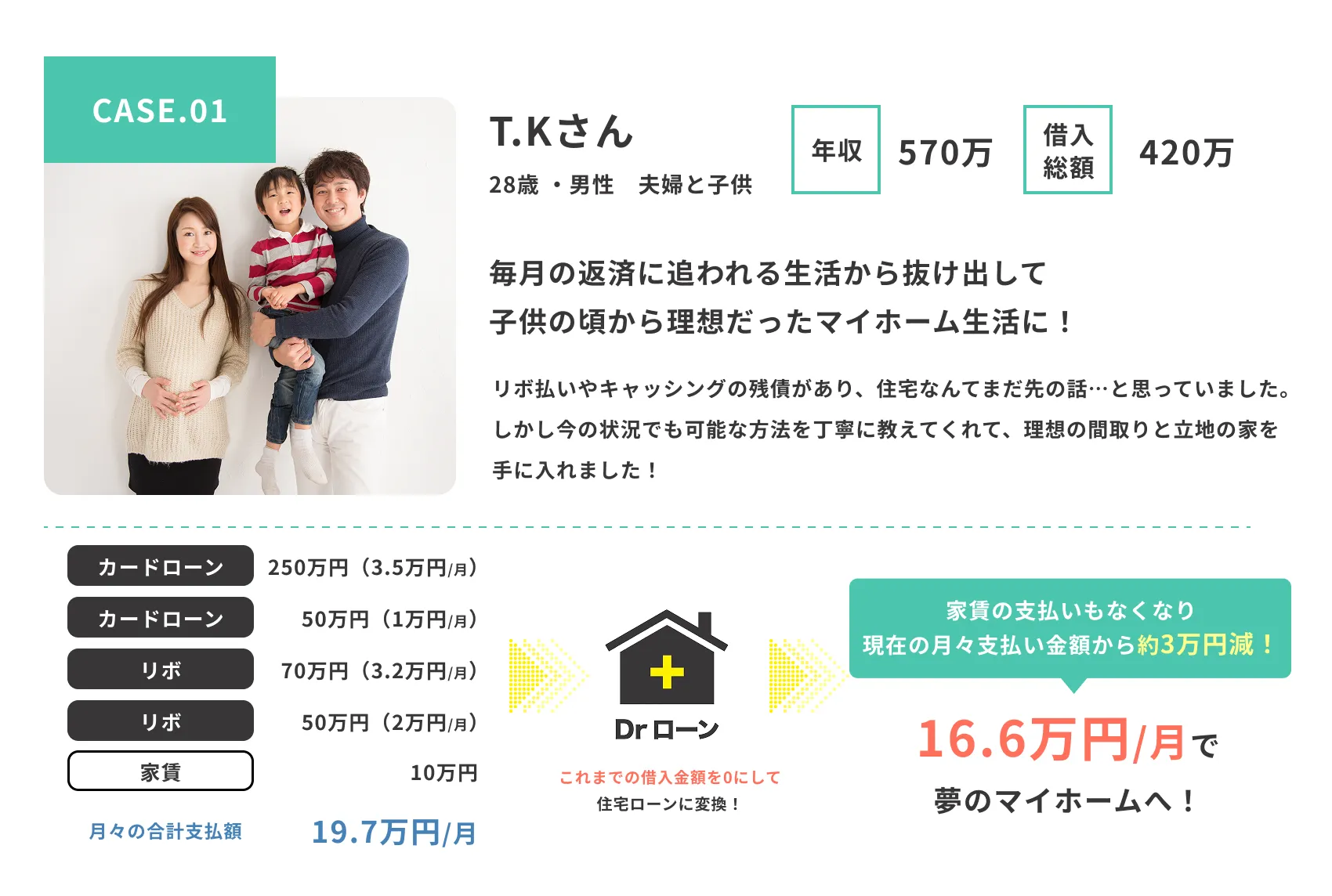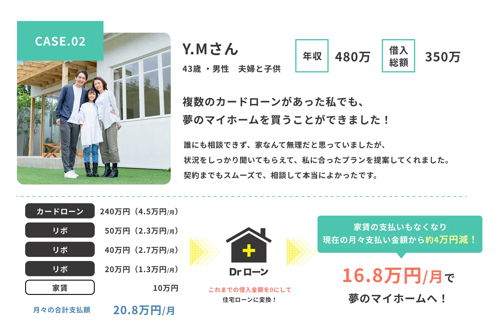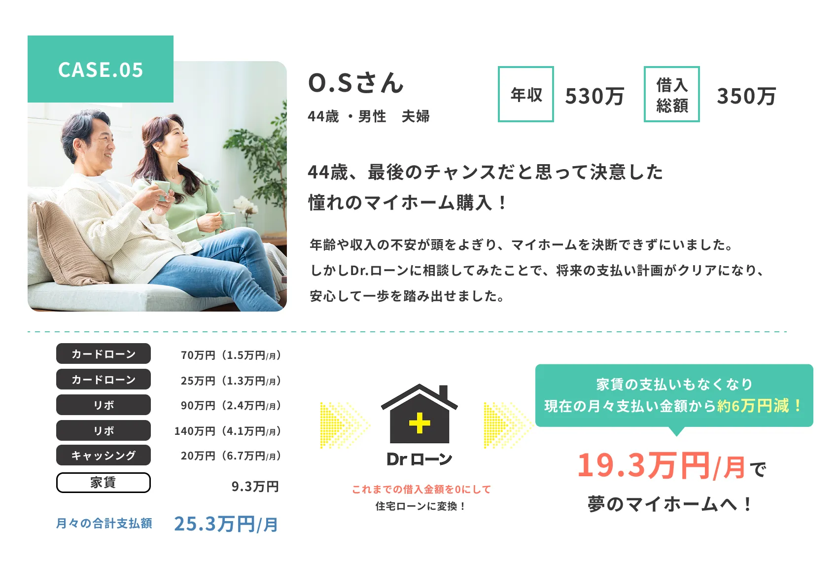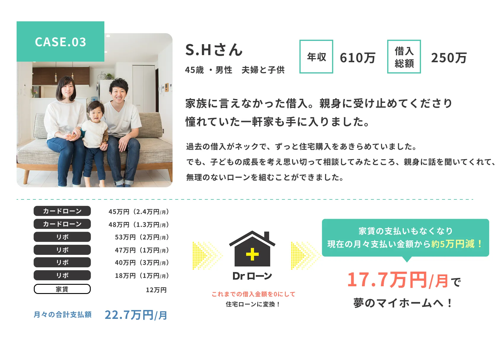 夢のマイホームへ。 Dr.ローンなら、さまざまな借り入れがあってもご相談可能。